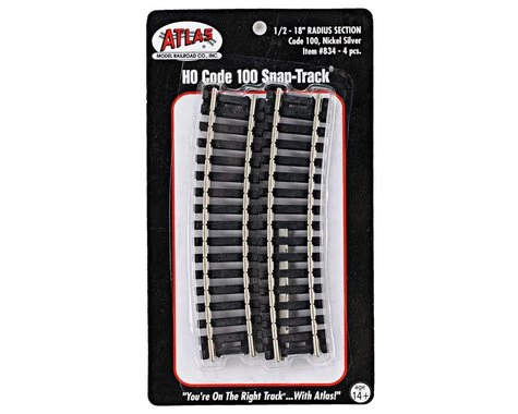 This is a pack of four Atlas Model Railroad HO-Gauge Code 100 18″ Radius 1/2 Curves.Â